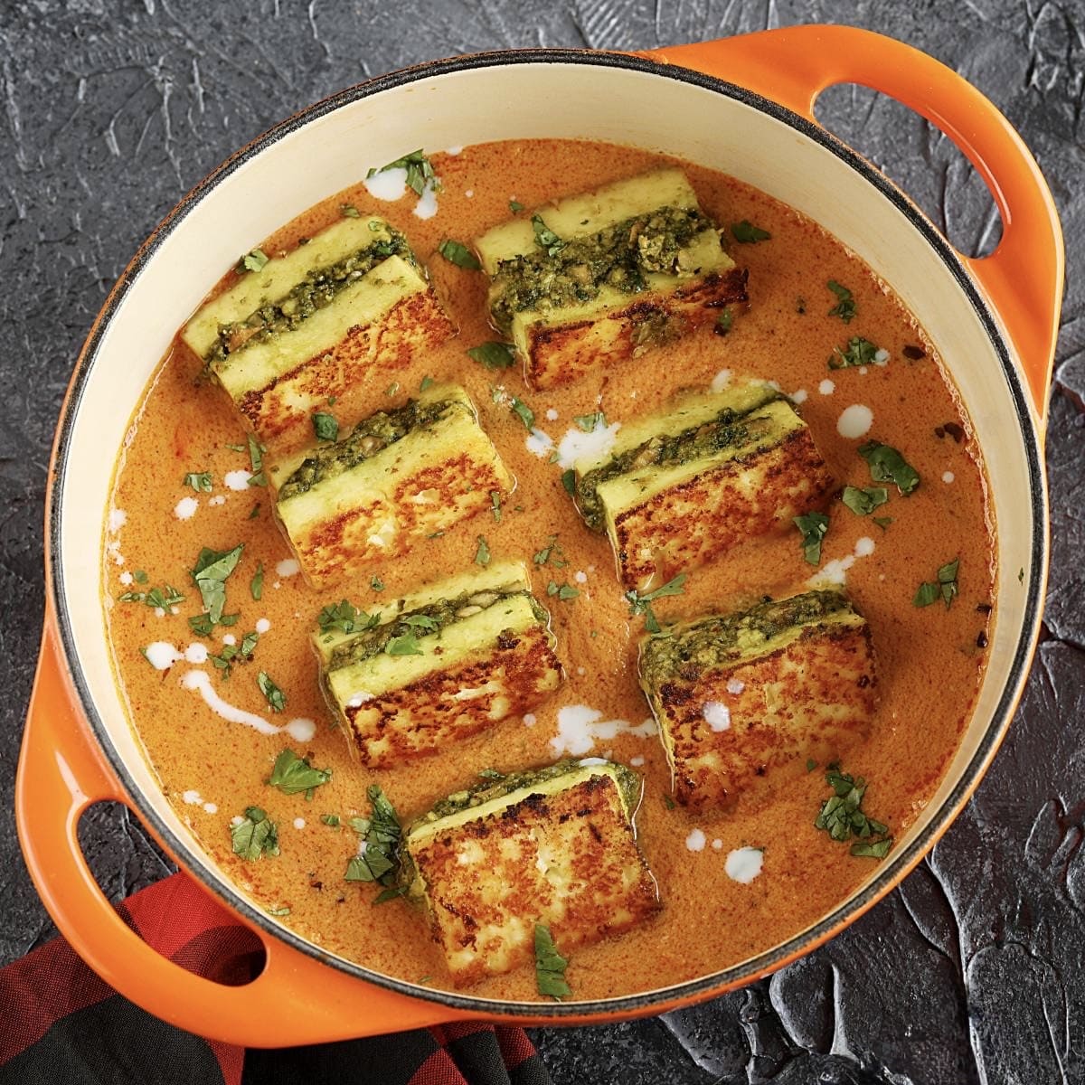 Triangle shaped three layer paneer simmer in creamy yellow sauce